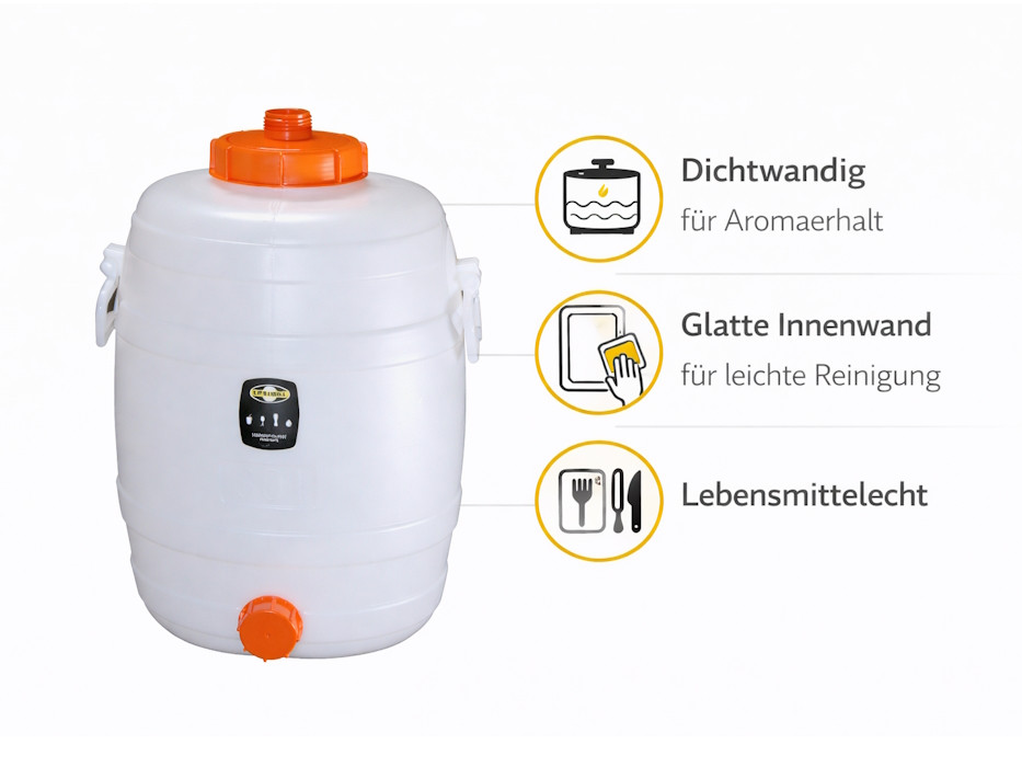 Fermentation bung and tap are available as accessories (not included in delivery).